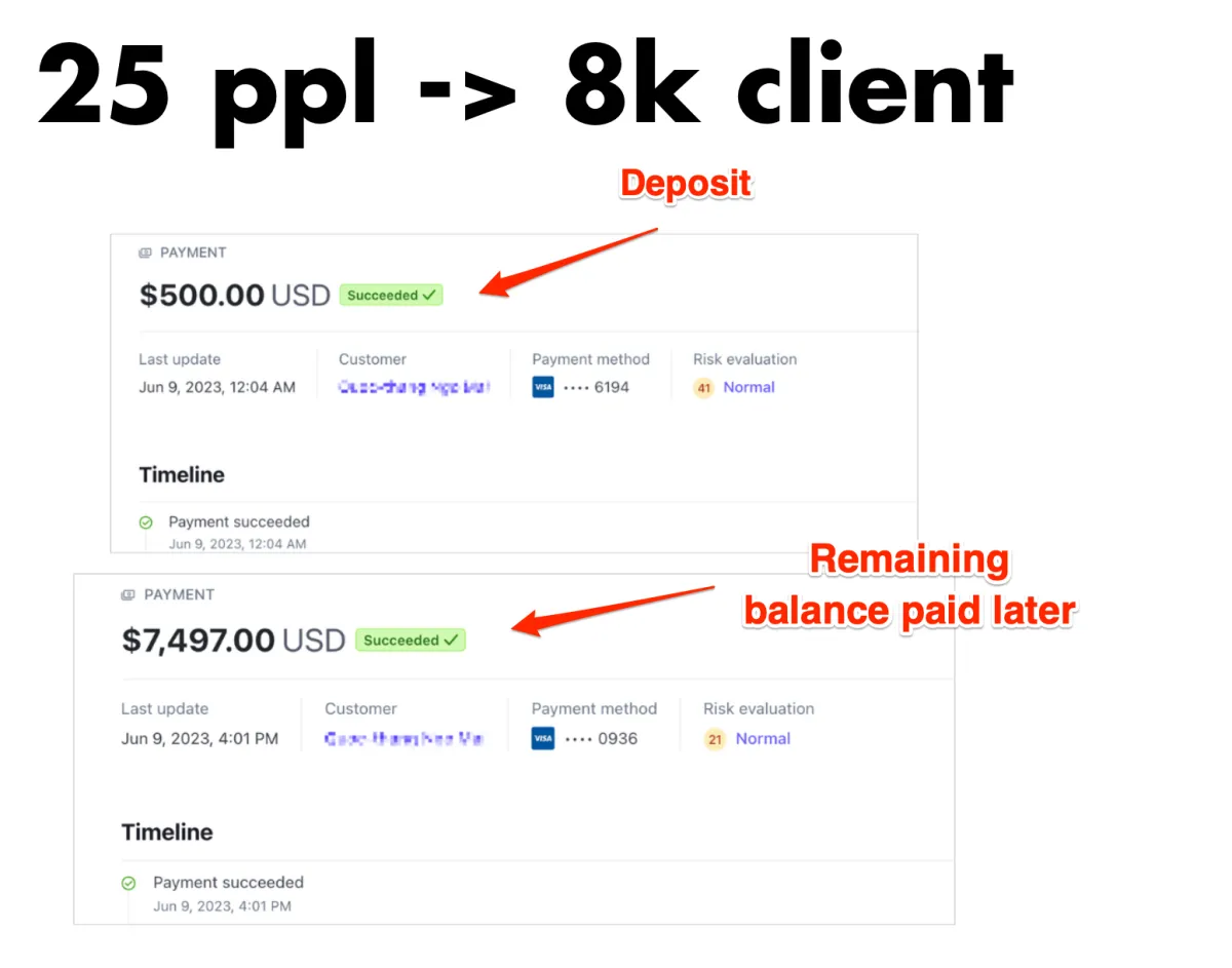 ... and after my client approved his application and send him a stripe link to pay the rest via email (remember, no sales call, no chasing in DMs), the client paid. The same day.